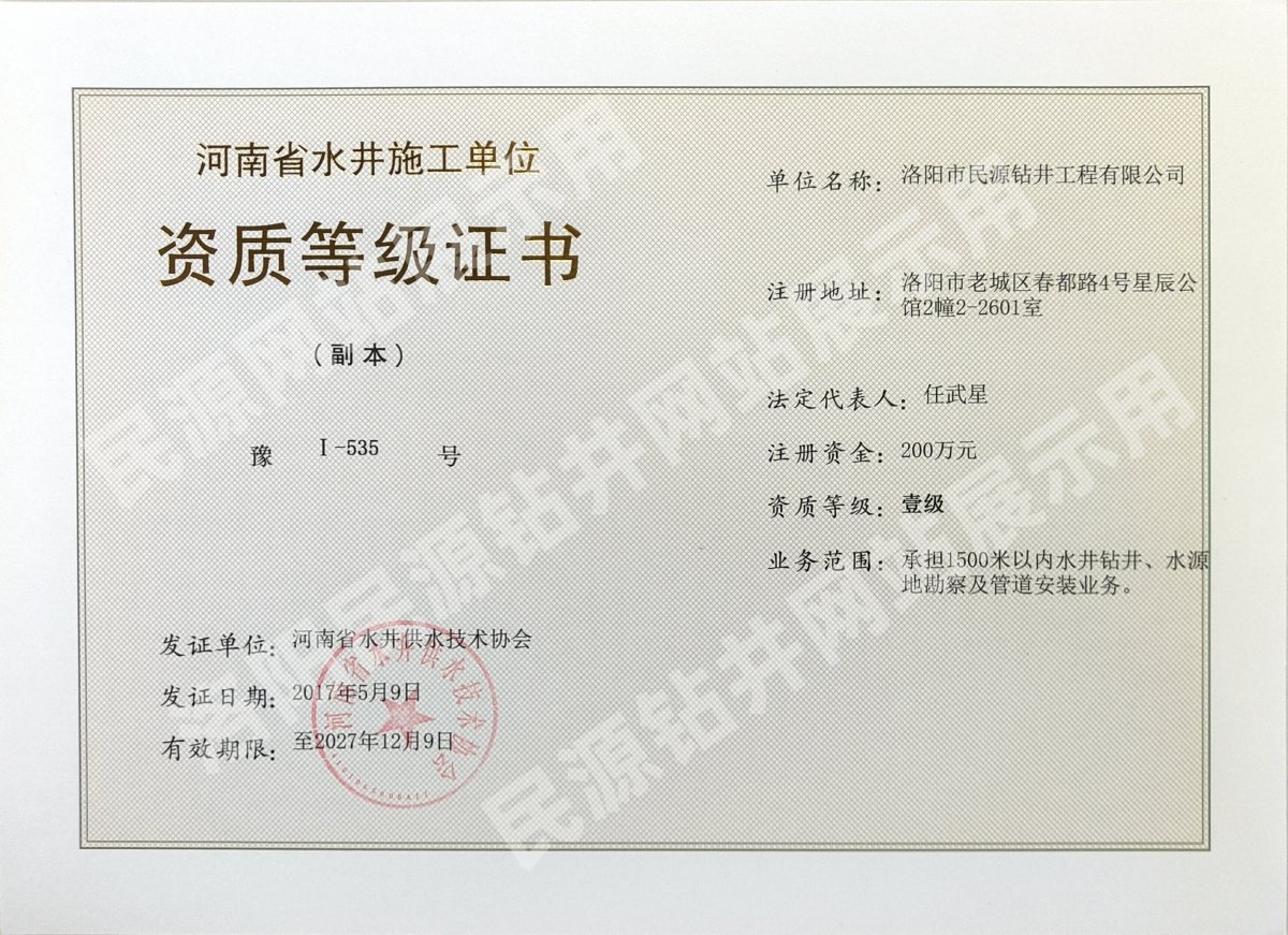 洛陽市民源鉆井工程有限公司專 業的施工團隊,具有鑿井行業資質證書。擁有水鉆400、300鉆機、空壓機、打樁機、潛孔錘十余臺;適用于農家打井、農田打井、機關單位打井、企業廠家打井、以及各種工程工地打井。